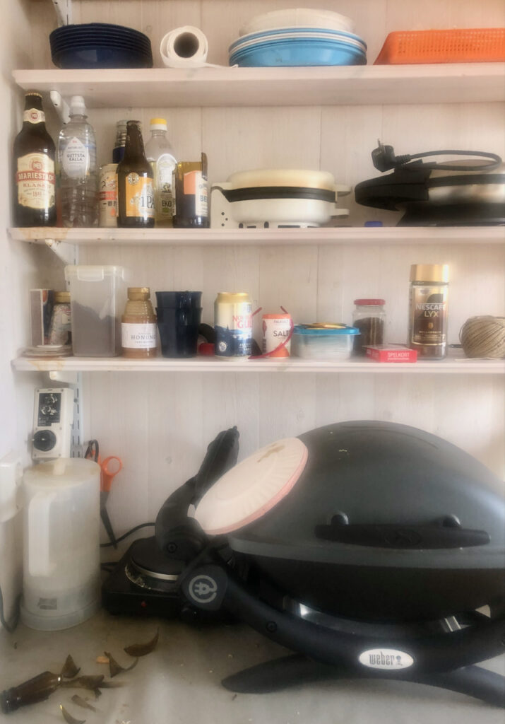 Men varför bara bara röja undan allt på en hylla av tre? Och vad är det där för kladd? Här har jag lagt tillbaka översta hyllan och lite av sakerna som låg där. Några papperstallrikar har hamnat på elgrillen.