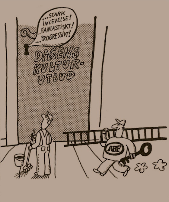 Illustration i tidskriften Fönstret 1974. Kulturutbudet är inlåst, men ABF skyndar till med nyckeln.