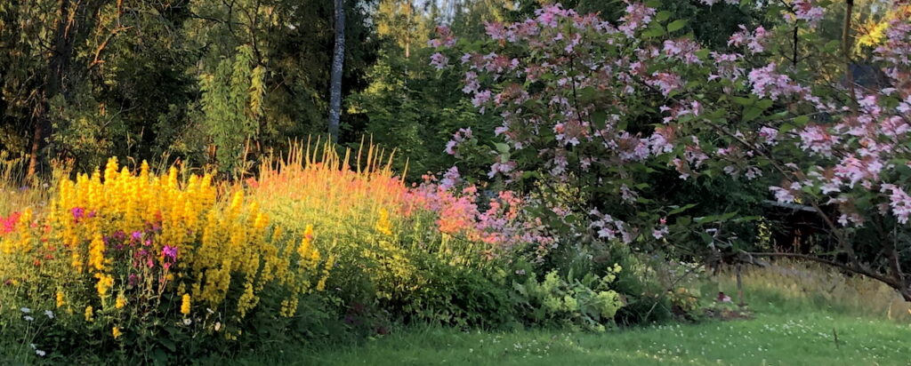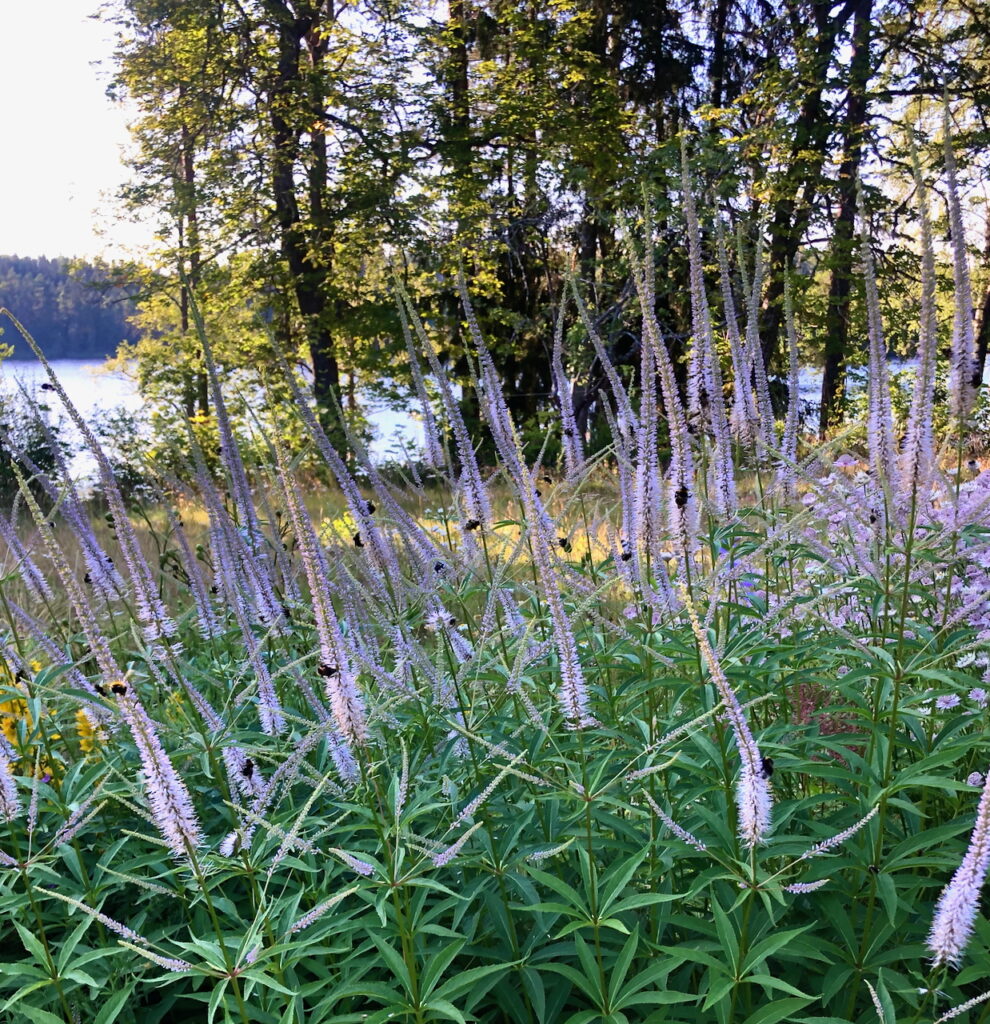 På den här bilden sticker axveronikan upp i rabatten och stjärnflockan skymtar bakom den. Längst fram finns en grupp med lysing, som gör skäl för sitt namn i kvällssolen.
