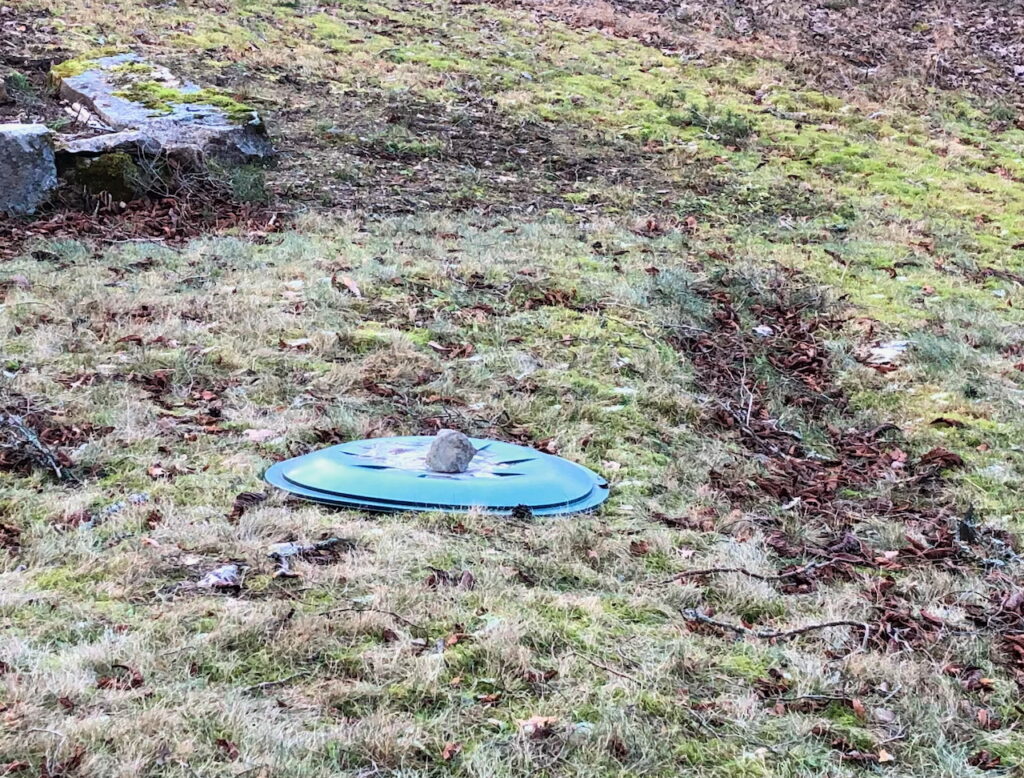 När jag var så gott som klar med uppröjningen lyckades jag åtminstone dokumentera det flygande brunnslocket med sin sten. Som ett flygande tefat. Det hade varit intressant att bevittna den luftfärden.