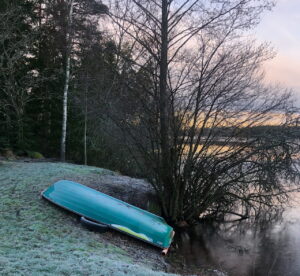 Vi drog upp båten ordentligt i höstas, men sedan har det regnat så mycket att den hamnat farligt nära vattnet. Nu har den fått flytta upp en bit till. Några tegelpannor som hade halkat ner och riskerade att släppa in regn och fukt i boden har lirkats tillbaka.