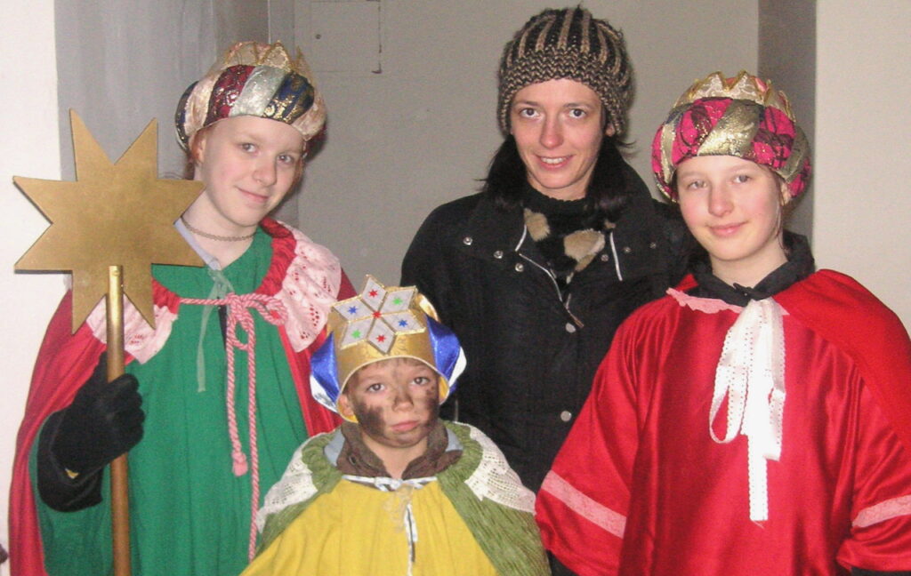 Österrikiska stjärngossar i mer traditionsnära huvudbonader än de svenska stjärngossarnas. Den medföljande mamman har hittat en passande vintermössa